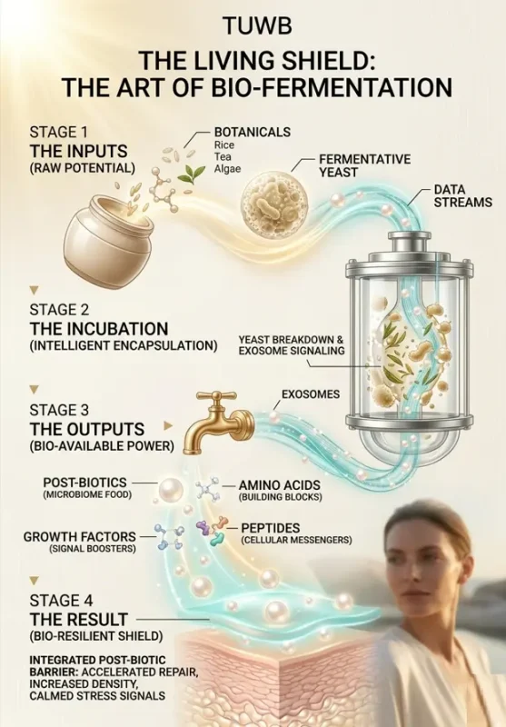 Fermentation takes standard botanicals—rice, tea, algae—and breaks them down into smaller, more potent molecules. This process creates natural probiotics and post-biotics that your skin recognizes as its own. It’s the difference between eating a raw grain and a piece of artisanal sourdough; the “living” version is simply more powerful.